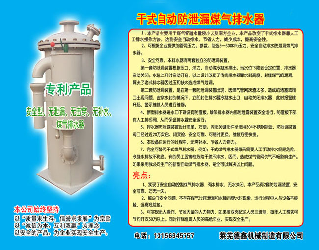 高灵敏免补水、双防泄漏煤气排水器